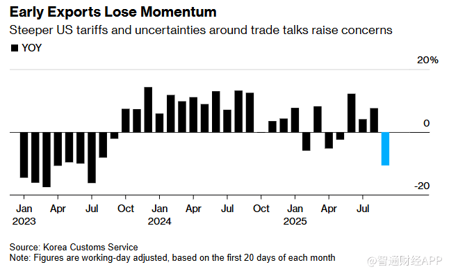 受美国关税影响,韩国9月份出口大幅下滑,这对依赖贸易的韩国经济来说是一个令人担忧的信号。根据韩国海关周一公布的数据,经工作日差异调整后的9月份前20天出口额同比下降10.6%。而经工作日差异调整后的8月全月出口额则修正为增长了6%。